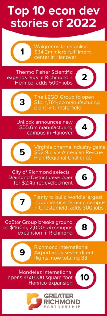 Greater Richmond landed several projects and expansions totaling billions of dollars in new capital investment in 2022 thanks to the strategic business advantages and resources found within the region’s localities. This positive economic momentum has prepared Greater Richmond for a strong 2023, but the region did not get here alone.