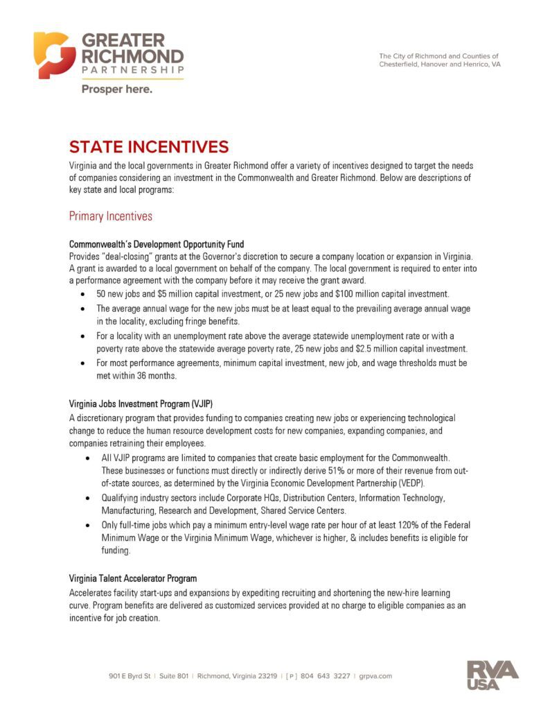 Virginia and Greater Richmond have established many business incentives that benefit new and existing businesses, both in the short and long term. Incentives include financial assistance, infrastructure development grants, tax credits and exemptions, customized training and technical support programs.