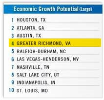 Business Facilities magazine mentioned that the Richmond Region “is a rising star that is well-positioned for sustainable growth for years to come.” Greater Richmond ranked above peer regions Nashville, Raleigh-Durham and Salt Lake City for economic potential.