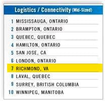 RICHMOND, VA – The Greater Richmond Partnership (“GRP”) announces that Business Facilities magazine, a leading bi-monthly publication specializing in the site selection marketplace, placed the Richmond Region fourth for economic potential and seventh for logistics/connectivity in its 14th Annual Metro Rankings Report 2018.