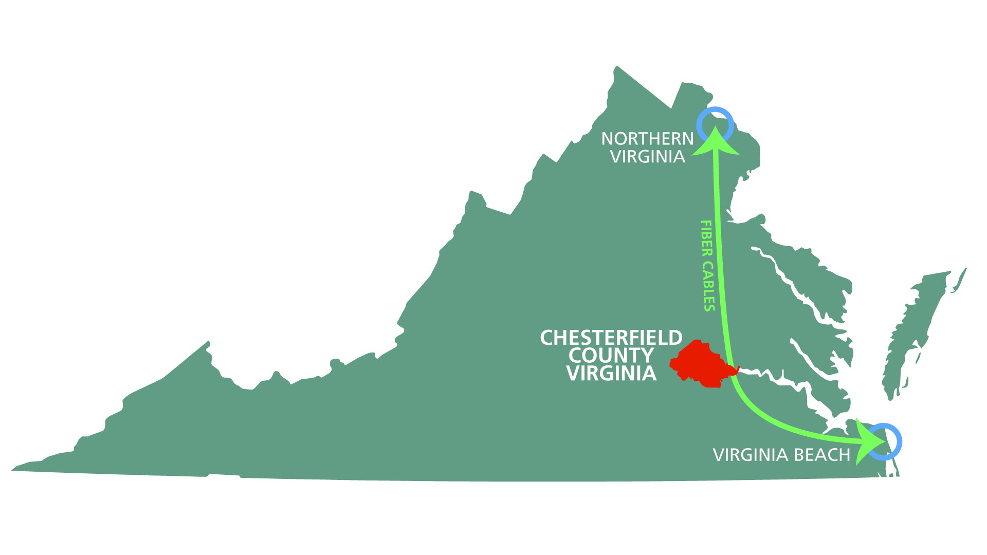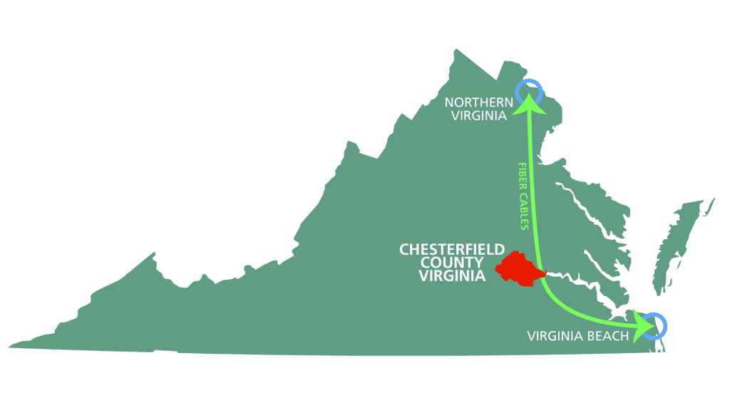 Currently, the epicenter of the North American data center market is in northern Virginia. The world’s fastest subsea data cables connecting the United States to Europe, South America and Africa come ashore in Virginia Beach. The fiber connecting these undersea cables with the digital hub in northern Virginia runs right through Chesterfield County.