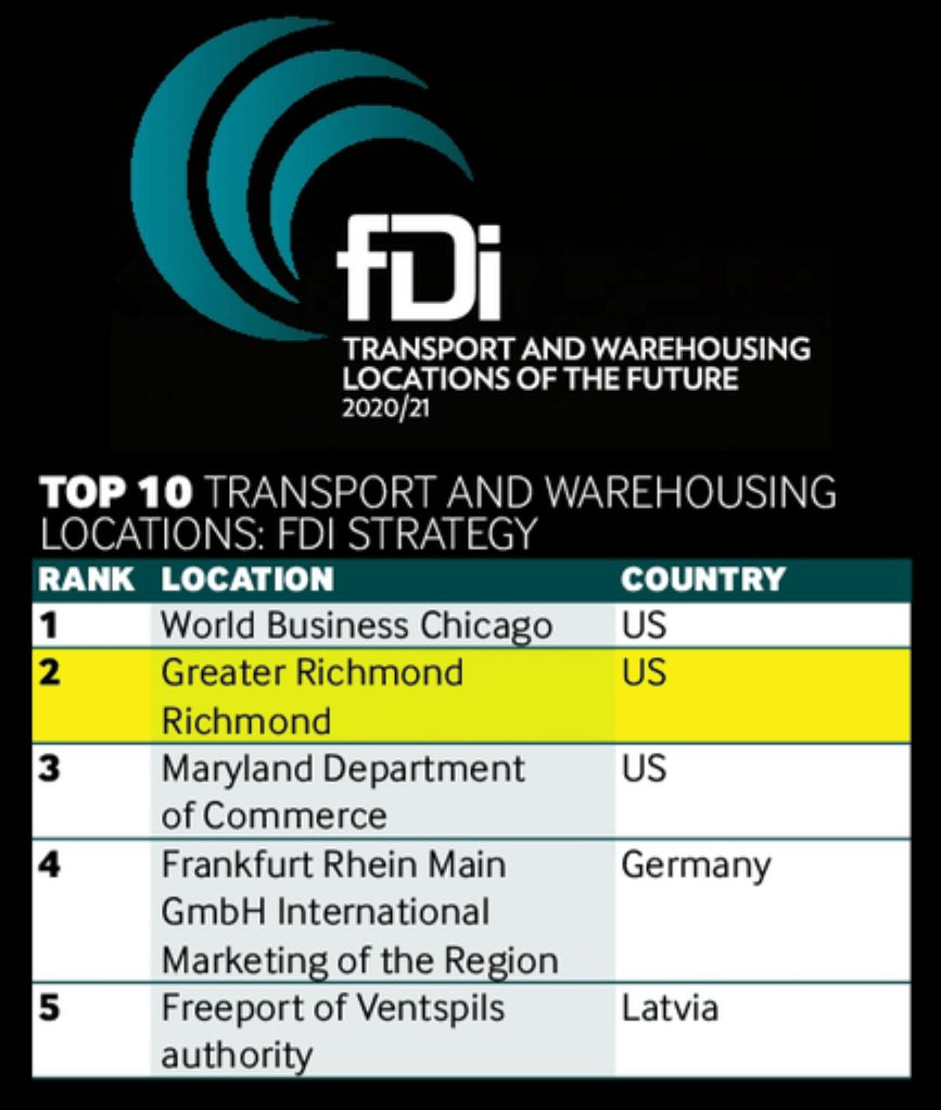 The Richmond Region is ranked between Chicago and the state of Maryland in fDi’s December 2020/January 2021 issue which highlighted Transport and Warehousing Cities of the Future. The report cites Greater Richmond’s strategic features such as its Mid-Atlantic location, Richmond Marine Terminal and Commonwealth Center for Advanced Logistics Systems as core benefits for investing in the City of Richmond and counties of Chesterfield, Hanover and Henrico.