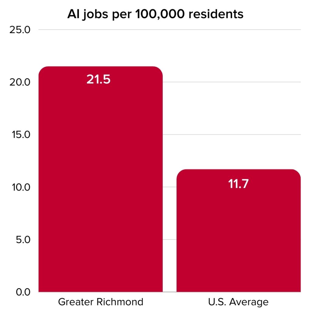 The Commonwealth of Virginia is a leading state for tech talent in part thanks to Greater Richmond’s long history as an IT hub. The surge in AI job postings within the region highlights Greater Richmond’s broad and diverse information technology cluster and solidifies the region’s top ranking for its tech talent. The addition of these AI jobs will also strengthen the region’s position as a hub for innovation and technological advancement.
