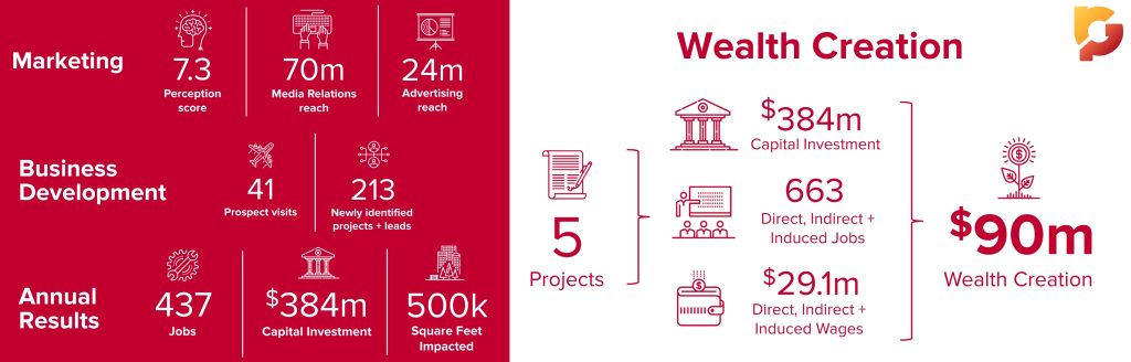 Through marketing efforts and business development activities, GRP assisted five companies in locating in the region that created 437 jobs and generated $384 million in capital investment, impacting 500,000 sq.ft. of real estate.