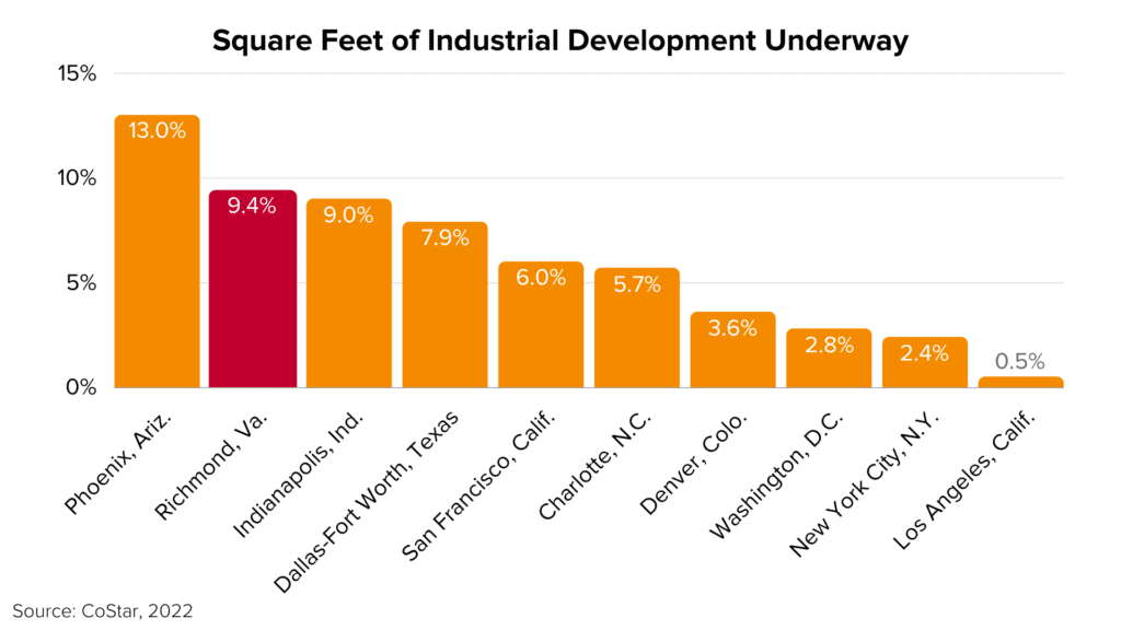 In addition to Greater Richmond’s workforce, resources and strategic location, industrial development is spiking as building costs are more affordable here than in larger, more expensive metro areas.