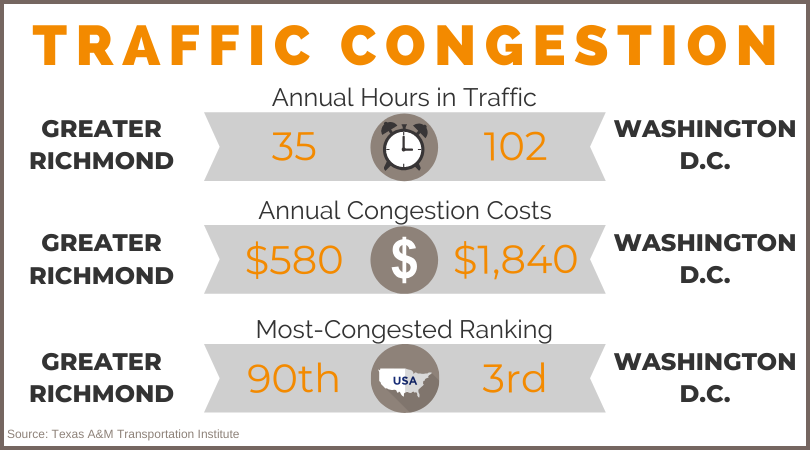 The Texas A&M Transportation Institute’s 2019 Urban Mobility Report highlights Greater Richmond, Va., remaining one of the nation’s least-congested large urban areas. The average commuter in Greater Richmond spends only 35 hours in traffic annually compared to the national average of 54 hours per year. Since 2014, the region has slightly increased from 34 to 35 hours per year in traffic and slid from the 77th most-congested area to the 90th.