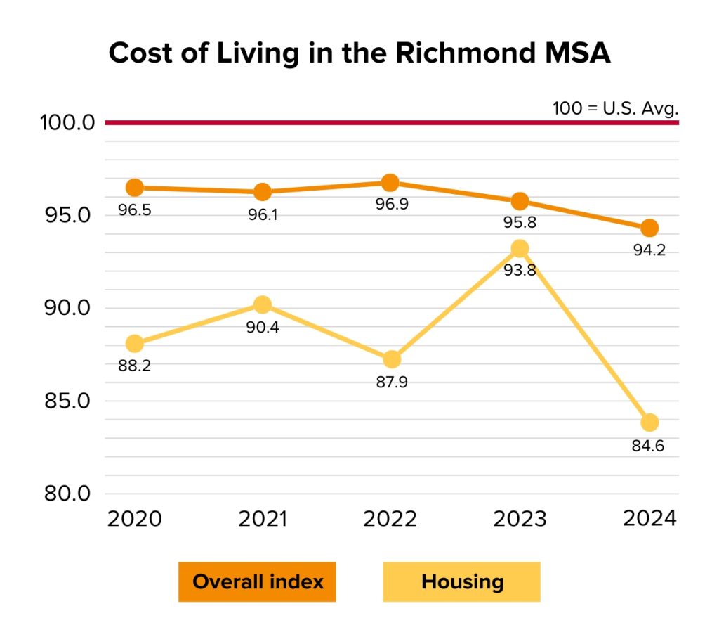 The Council for Community and Economic Research (C2ER), a nationally recognized authority in economic, community and workforce research, finds a slight decrease in the Richmond MSA’s overall cost index compared to 2023. According to the 2024 Annual Average Cost of Living Index, the Richmond MSA’s cost of living dropped nearly two index points from 95.8 in 2023 to 94.2 in 2024. The MSA’s cost of living sits nearly six index points below the national average of 100. The C2ER’s annual Cost of Living study analyzes prices for housing, utilities, transportation, healthcare and groceries as well as miscellaneous goods and services.