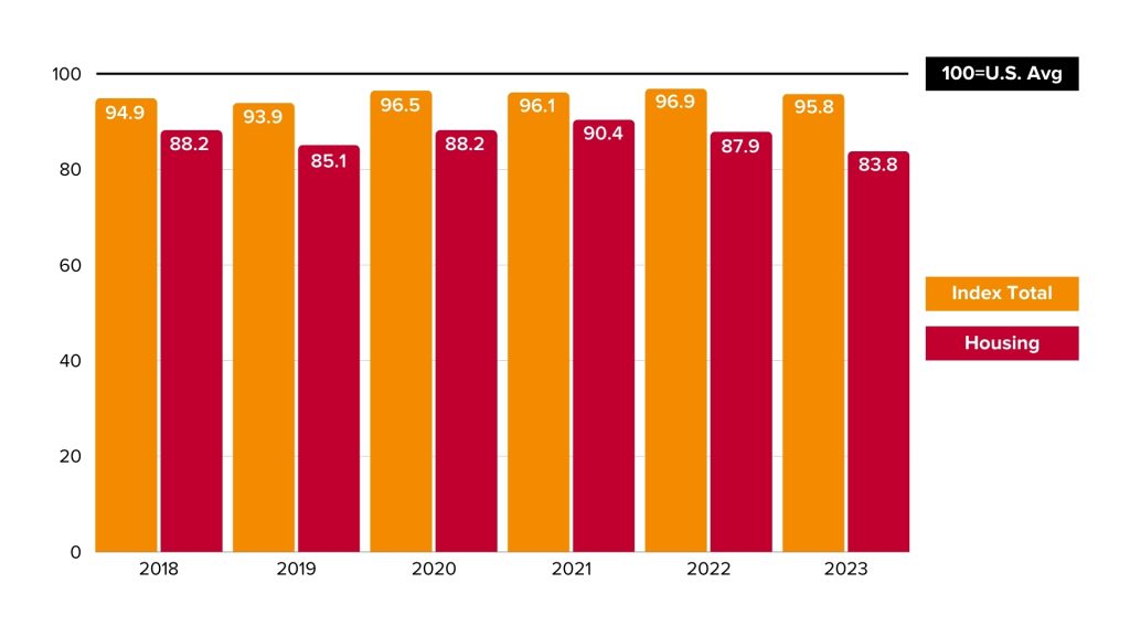RICHMOND, Va. (Feb. 14, 2024) – The Cost of Living Index in the Richmond MSA has decreased by more than one whole point since last year according to the Council for Community and Economic Research. The Richmond MSA’s Cost of Living Index for 2023 is 95.8, more than four points below the U.S. average, and down from 96.9 in 2022.