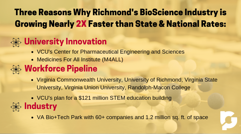 Bioscience firms in Richmond are growing at nearly twice the rate of Virginia and the United States, according to Chmura JobsEQ. In Greater Richmond alone, over $140 million have been invested by bioscience businesses since 2008. The region’s bioscience industry is thriving with no signs of slowing down.