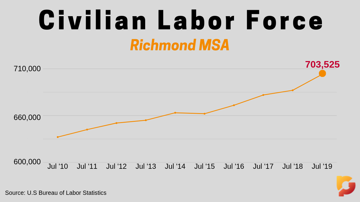 Over the past seven years, the Richmond MSA has seen its best civilian labor force and employment numbers. The region has broken its own records for the highest number of civilian labor force and employment for four consecutive years with 2018 and 2019 having one of the lowest unemployment numbers and rates on record.
