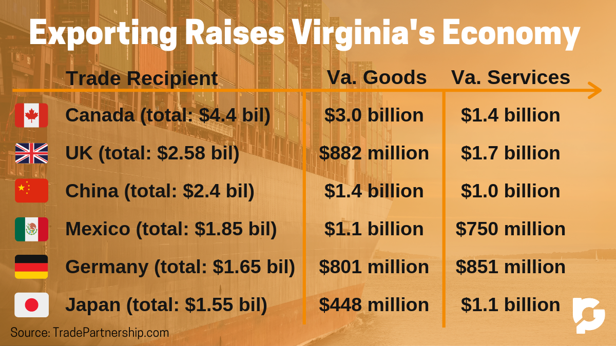 When asked about exporting, most companies think of shipping a tangible object overseas. However, it’s much easier for service companies to export because of advances in communication and technology. Virginia’s top service exports for 2017 include travel at $3.3 billion, management and consulting services at $2.9 billion, and computer and data services at $2.1 billion.